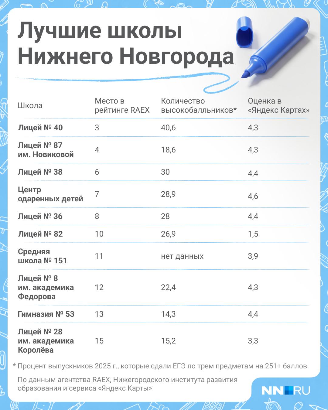 Рейтинг RAEX существует уже шесть лет, и состав лидеров меняется незначительно. В прошлом году первые места заняли лицеи №3 и №15 из Сарова. В Нижнем Новгороде наиболее высокие позиции у лицеев №40, №87 и №38.