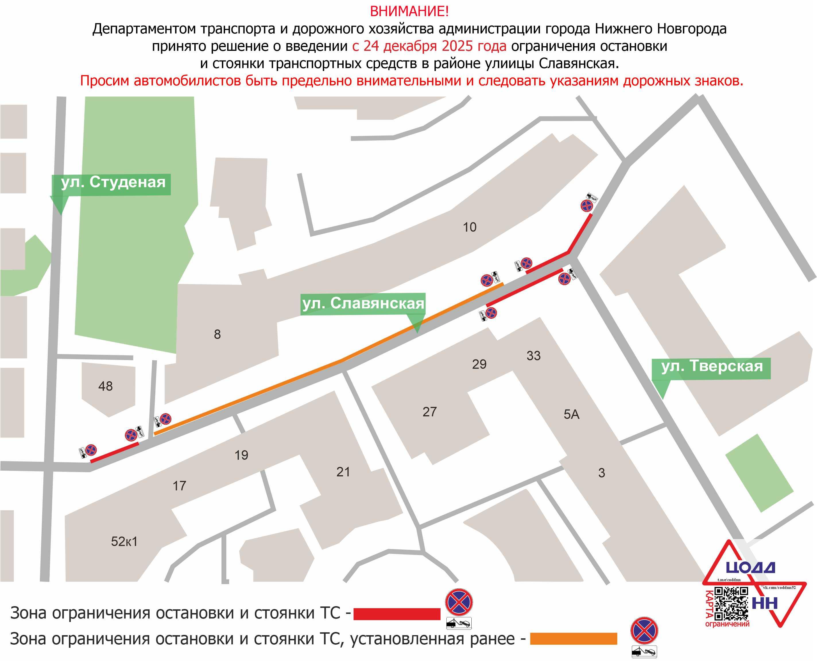 С 24 декабря на улице Славянской в Нижнем Новгороде будет запрещена остановка и стоянка транспорта. Ограничения коснутся участка между улицами Студеная и Тверская, как сообщает городская администрация.