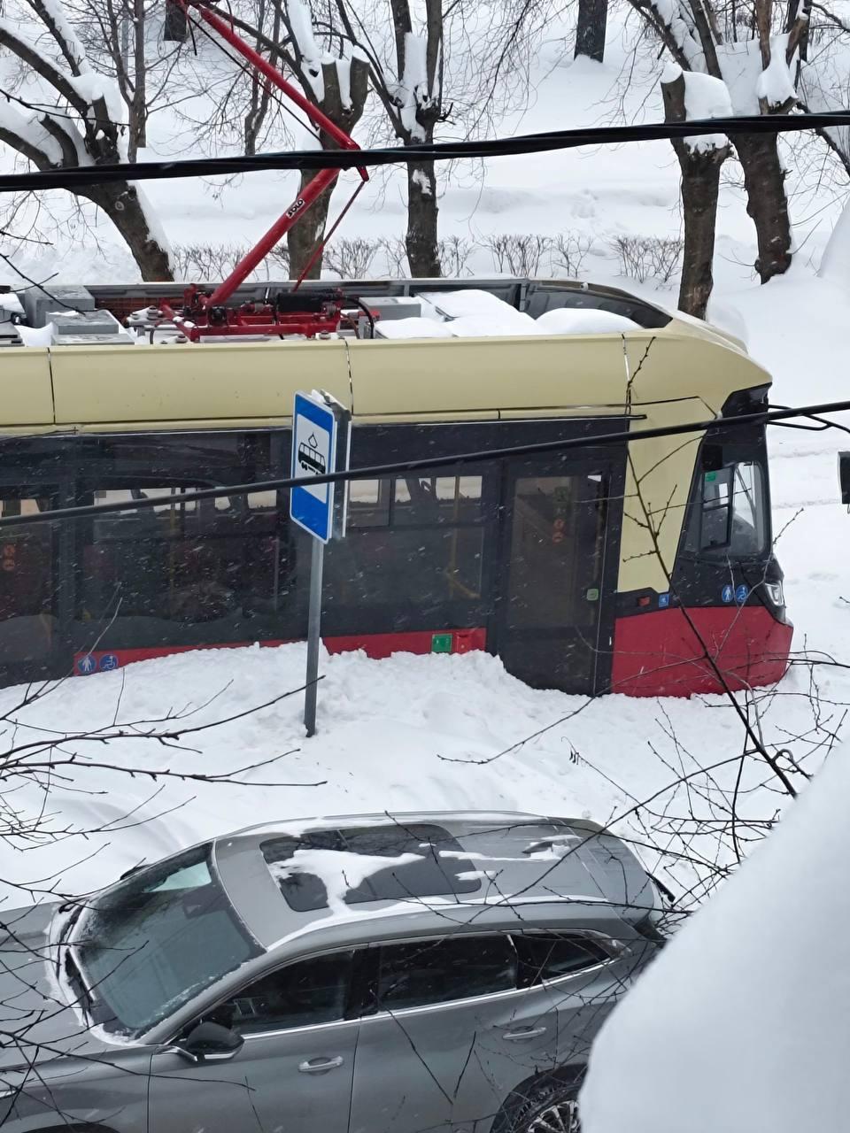 Трамвай сошел с рельсов в Нижнем Новгороде из-за снега
