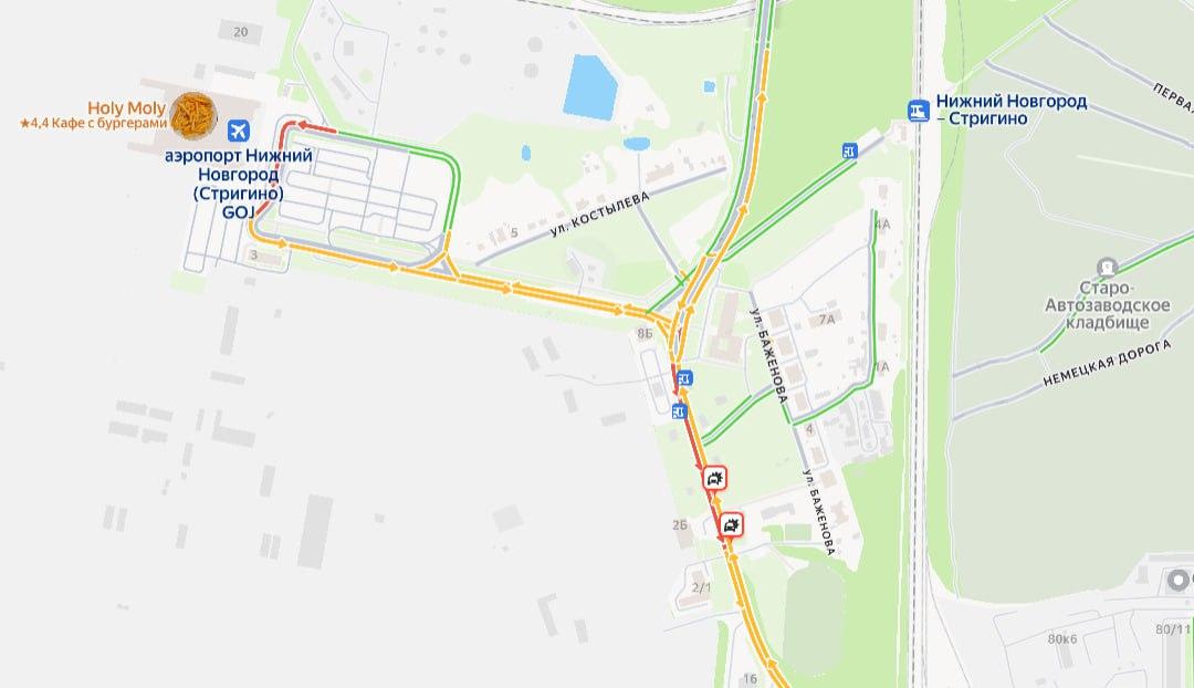 В районе остановки «Музей Авиаторов» движение в обоих направлениях полностью остановилось. Пробки начинаются уже на повороте с Ореховской улицы.