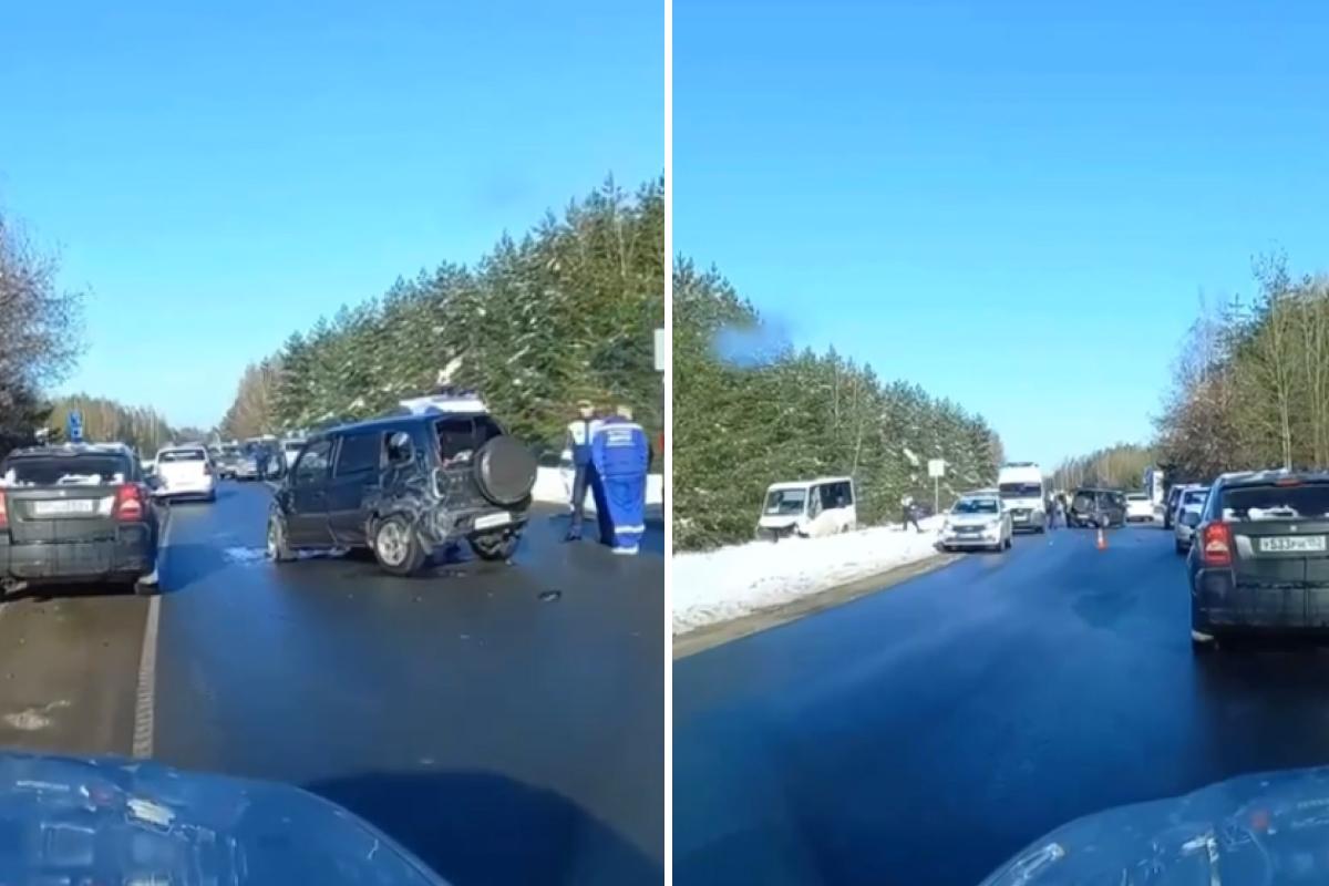 Движение на участке дороги затруднено. По словам автомобилистов, утром наблюдался сильный гололед, который мог стать причиной аварии.