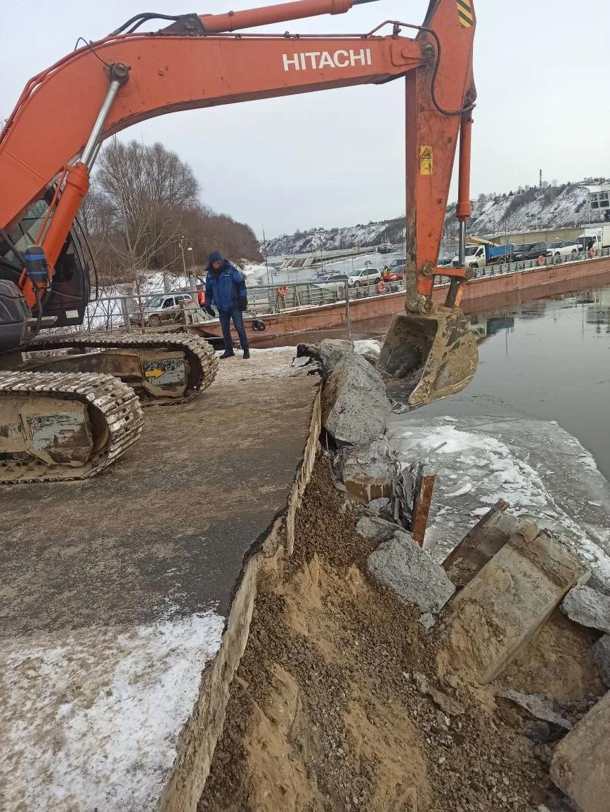 Начался демонтаж повреждённых конструкций берегового устоя моста.