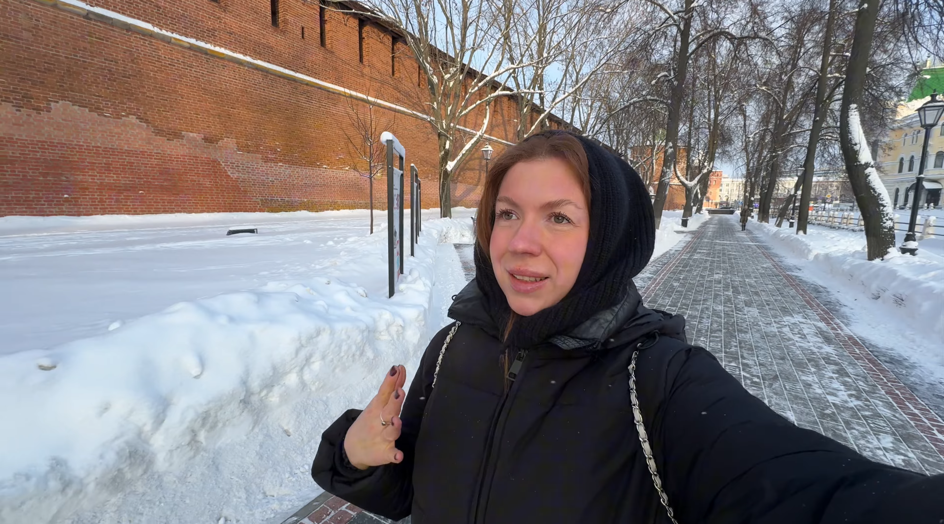 Свои 12 дней в городе она провела, общаясь с близкими и совершая пешие прогулки. Особенно запомнилась ей прогулка вдоль кремля, где она могла любоваться заснеженными видами.